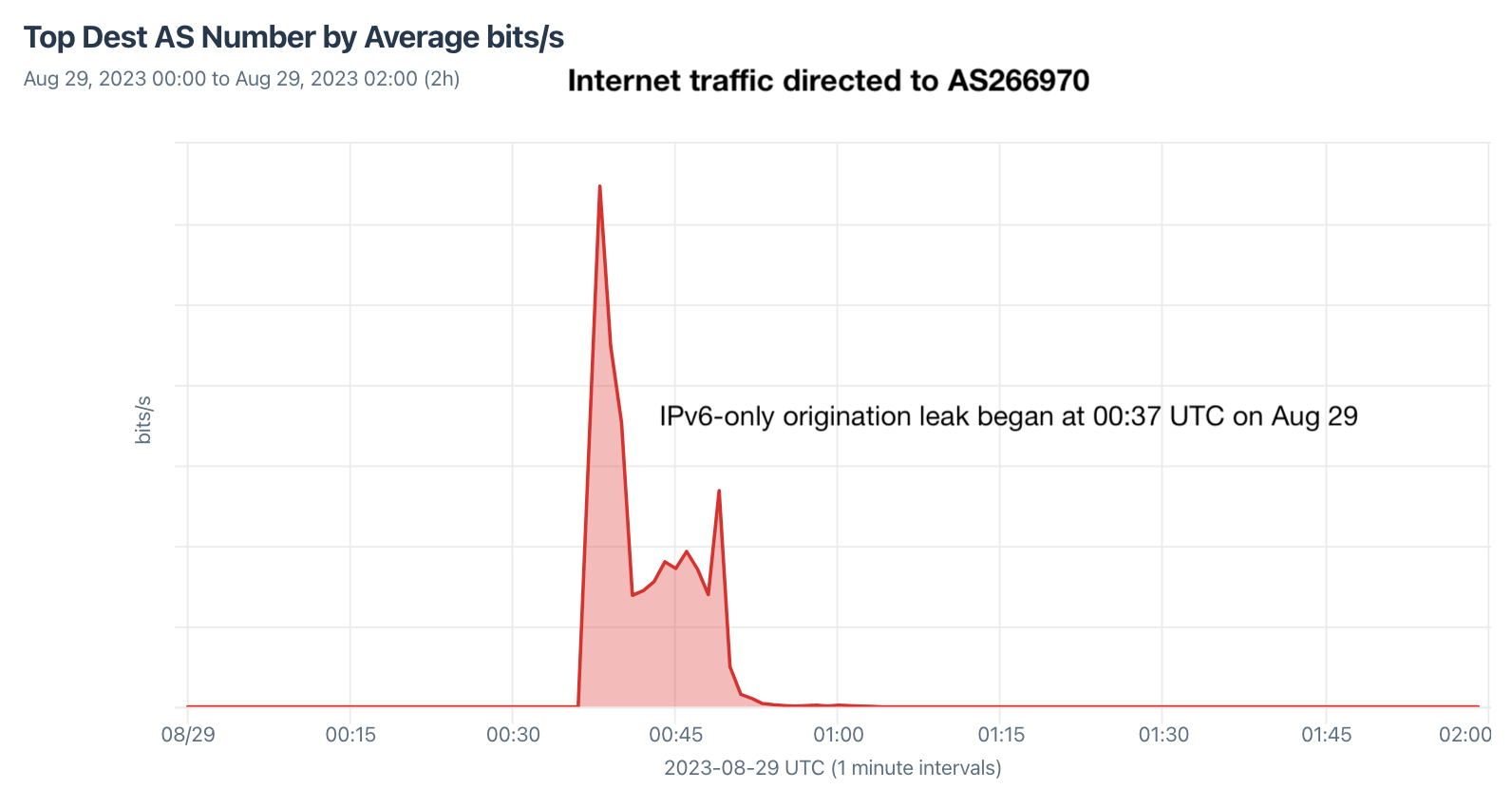 And then on Tuesday, August 29, AS266970 accidentally began originating nearly every prefix in the IPv6 global routing table. This lasted for 10 minutes and resulted in the misdirection of a significant amount of internet traffic, as observed in our aggregate NetFlow, pictured below.