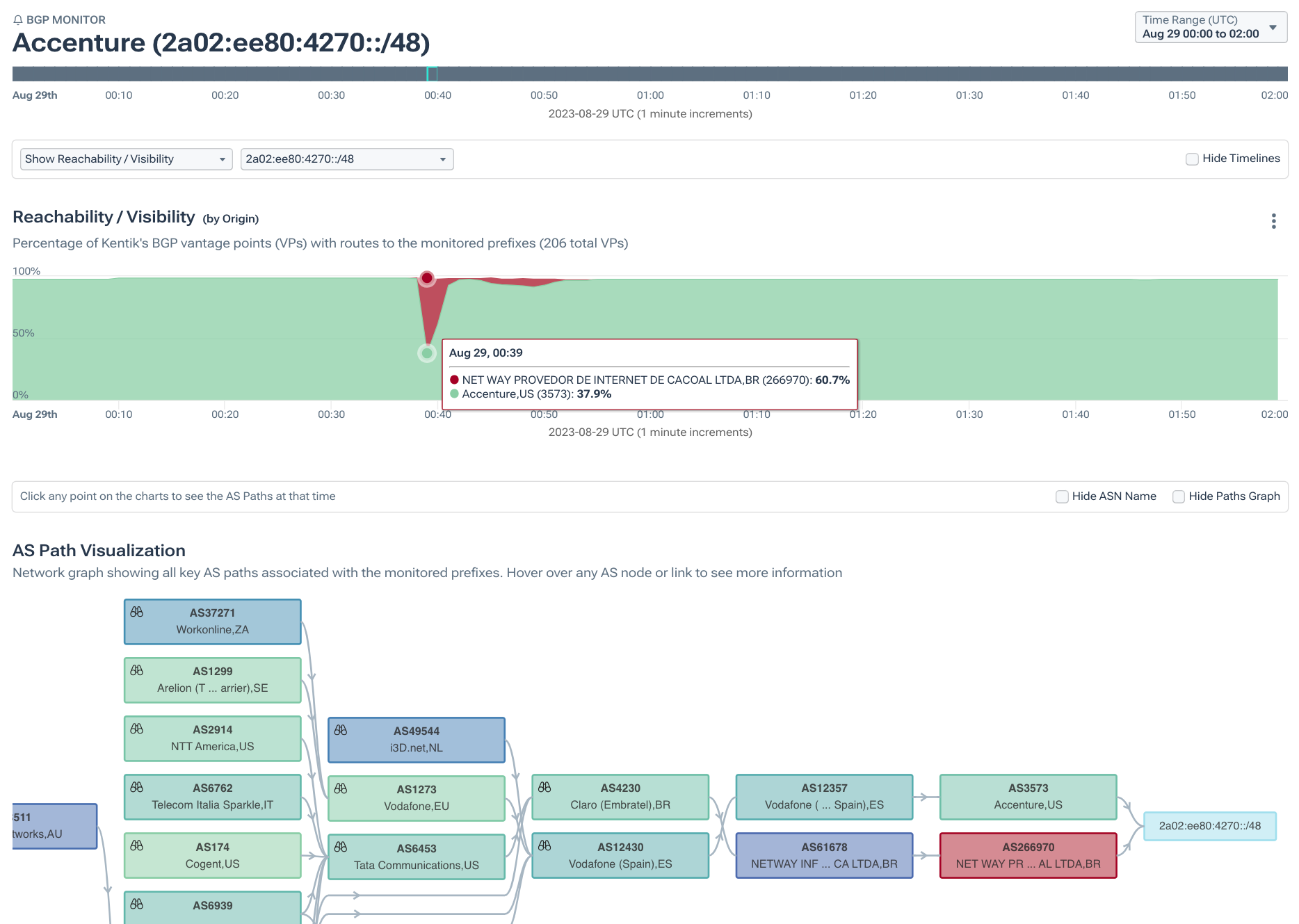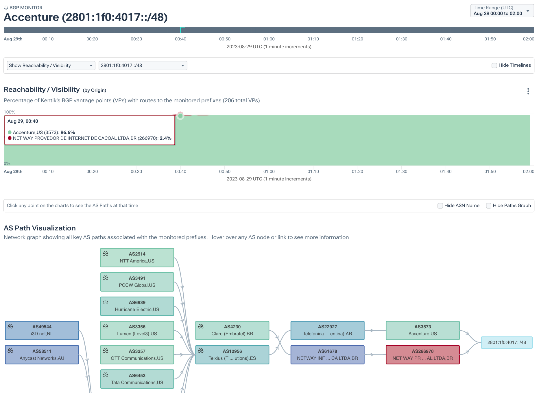 Conversely, 2801:1f0:4017::/48 was also originated by AS3573 and was impacted by the leak. However, at its peak, only 2.4% of our BGP sources saw the leaker (AS266970) as the origin. 2801:1f0:4017::/48 has a ROA that asserts AS3573 as the valid origin, and was hardly impacted by the leak.