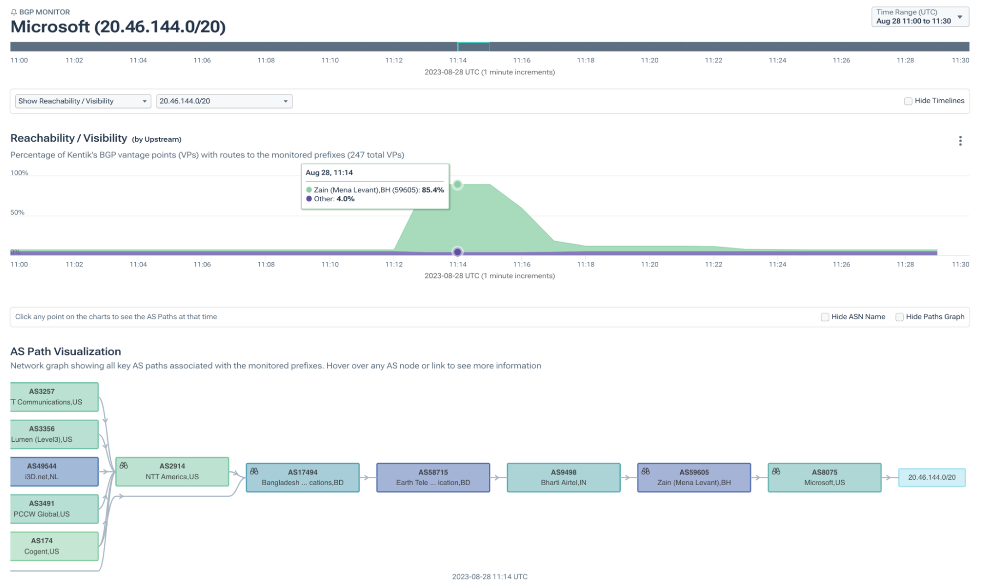 In fact, if we visualize the propagation of this route using Kentik’s BGP visualization, we can see 85.4% of our BGP sources would have chosen to send traffic to the IP addresses in 20.46.144.0/20 and other similarly leaked routes via AS58715 in Bangladesh.