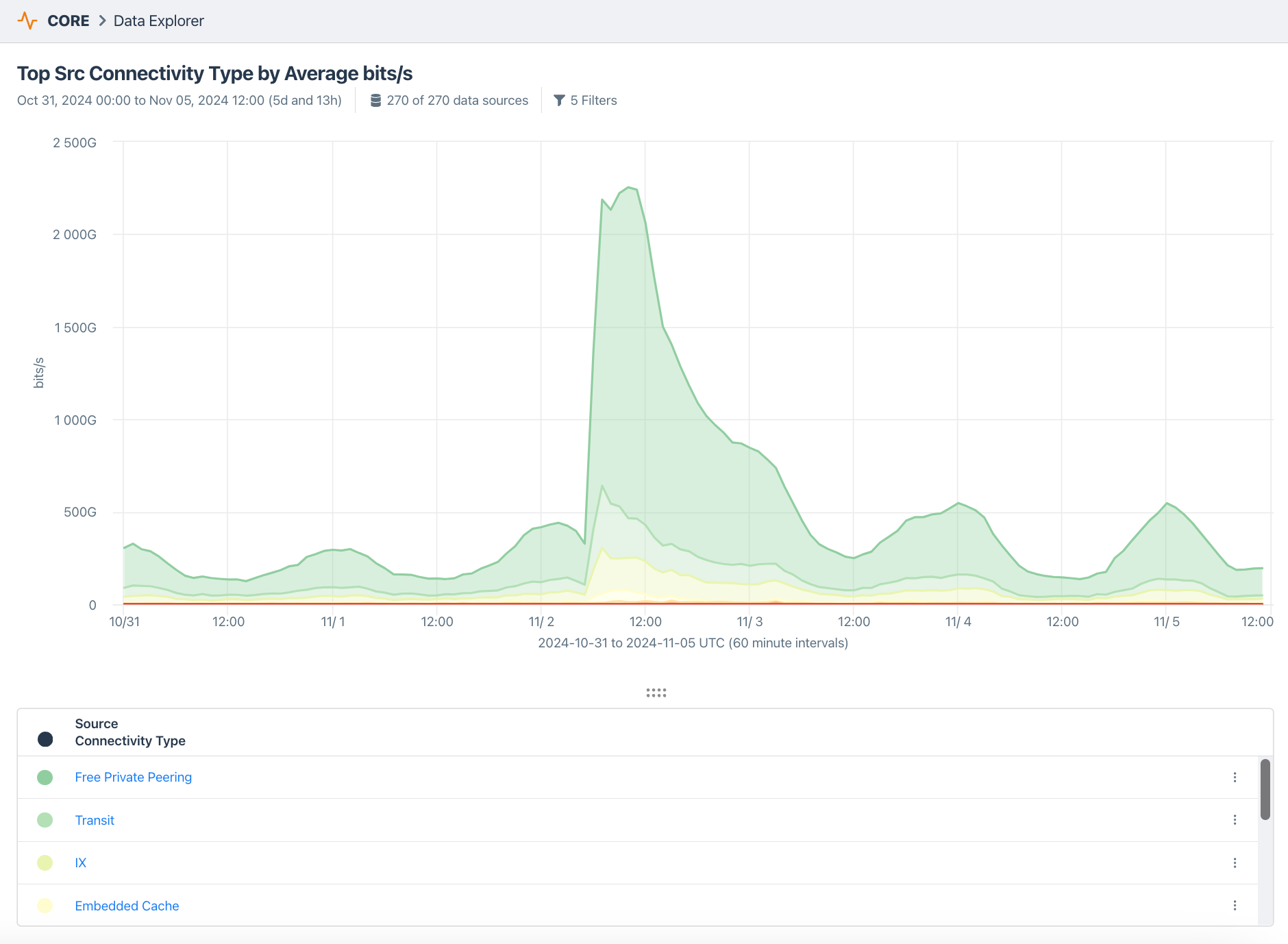 When broken down by Connectivity Type (below), Kentik customers received the Snoop Dogg-themed update from a variety of sources including Private Peering (72.8%, both free and paid), Transit (12.8%), IXP (11.3%) and Embedded Cache (1.9%).