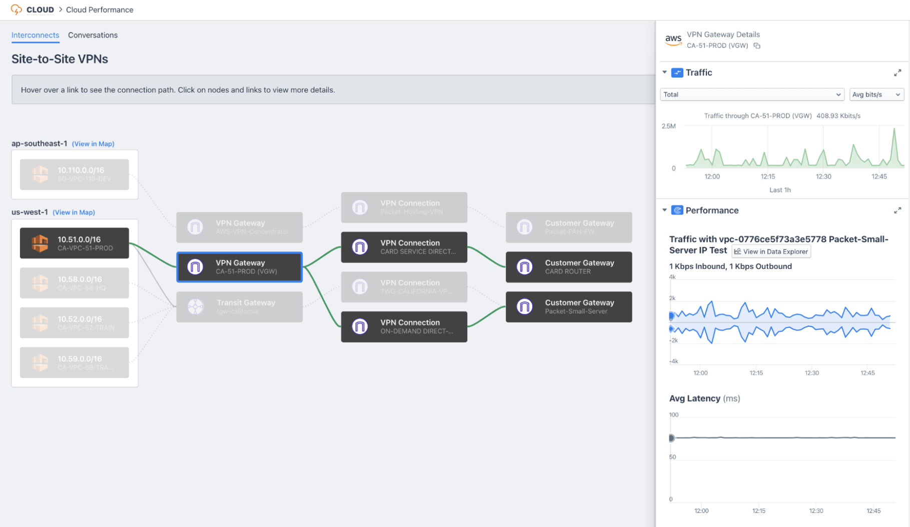 People can use the map to discover misrouted, rejected, or unwanted traffic patterns. Using the map to understand the flow of traffic around your cloud environment is so easy that you’ll never want to use your cloud console again. Best of all, the map is integrated with your on-prem data so you can now enjoy a complete and seamless experience as you troubleshoot issues in your data center through to your VPC architectures.