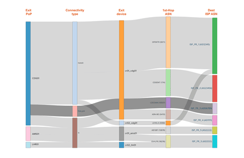 The resulting diagram shows where (from which of your devices) the traffic with a given destination ASN is leaving your network, as well as the 1st hop ASN for that traffic. By combining that information with your cost information for each of those ASes, you can now develop an overview of your outbound traffic cost structure in the selected country.