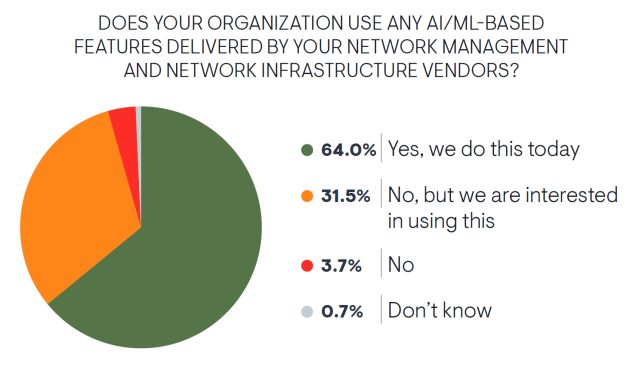 AI and machine learning are becoming mainstream, with 64% of organizations using these features to boost security threat detection, automate problem fixing, and improve network troubleshooting. The impact of AI/ML on network management is huge, offering new levels of efficiency and accuracy.