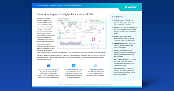 Kentik provides network intelligence for higher education and research networks, transforming massive volumes of network data into real-time action to improve performance, increase reliability, reduce costs, and fuel innovation at scale.