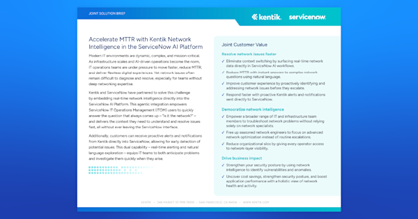 With Kentik’s agentic integration, ServiceNow ITOM users can access deep, real-time network telemetry using natural language prompts inside the ServiceNow AI Platform.