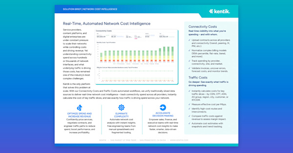 Network Cost Intelligence helps service providers, content platforms, and digital enterprises optimize spending and increase revenue by providing real-time, automated insights into connectivity and traffic costs.