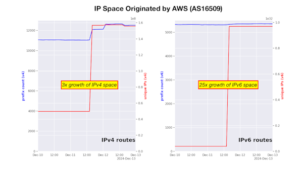 Of the newly originated prefixes from AWS’s AS16509, 19 of the new prefixes were IPv6 and the rest were IPv4. Despite the small number of new IPv6 routes, the size of the IPv6 footprint (as measured in unique IP addresses) grew by 25 times from 3.875 × 10^29 to 96.924 x 10^29, while the size of the IPv4 footprint grew by three times (from 49M to 157M).