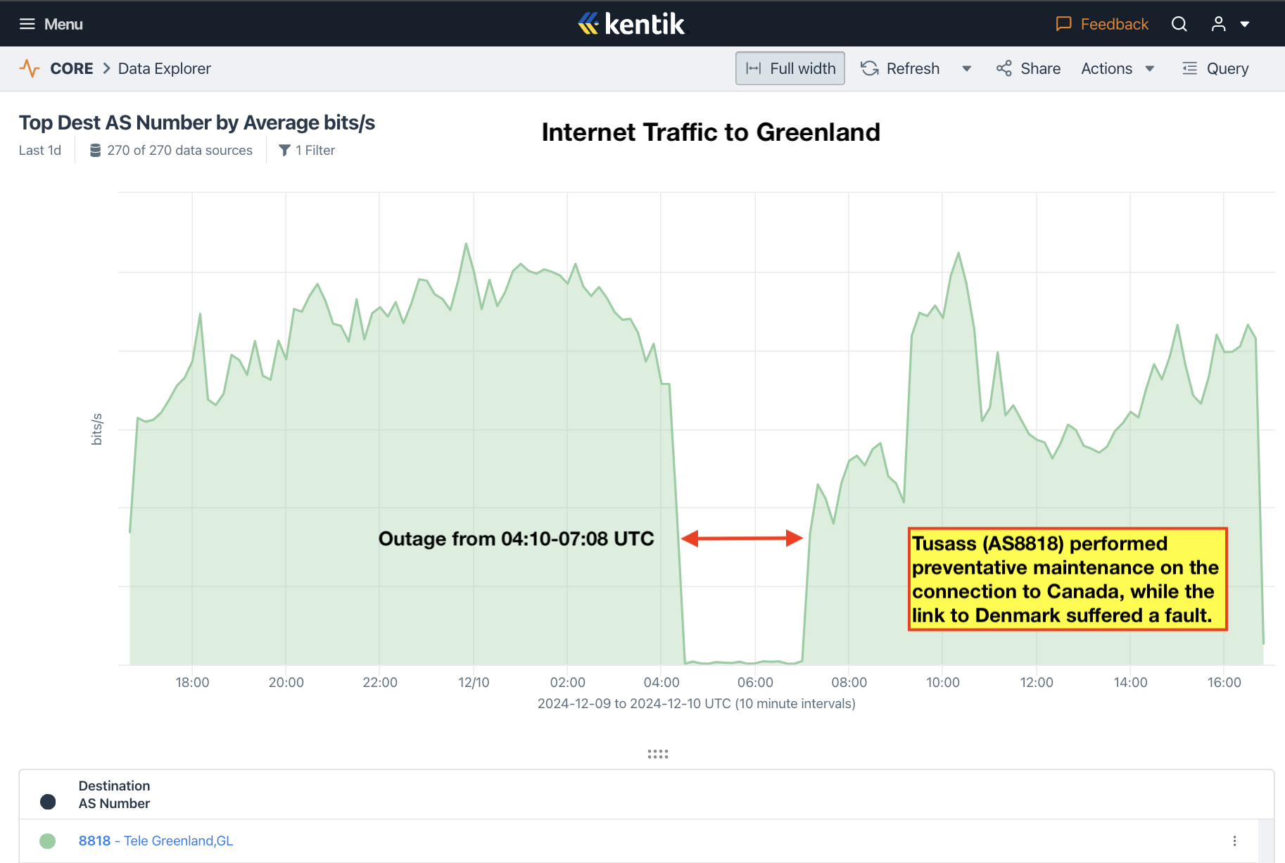 The cause of the outage was a combination of the effects of preventative maintenance on the Tusass’s link to Canada and a fault on the connection to Denmark. The outage was also visible on the IODA outage tool.