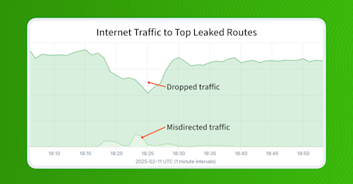 The resulting performance impacts of these traffic shifts get picked up in the Map, such as in the case below where two cloud regions in Johannesburg, South Africa (Azure’s southafricanorth and Oracle’s af-johannesburg-1) both experience simultaneous jumps in latency at 12:27 UTC on February 12, 2025. Latency to Azure’s uaenorth region in Dubai, UAE, jumped from 100 to 253ms.
