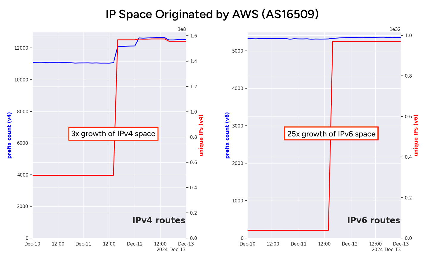 A little more than a year ago, I published a brief post about AWS announcing over 1,000 new BGP prefixes, including numerous super-aggregate prefixes covering nearly all of the cloud provider’s assigned IP space. The result of this action was a threefold increase in unique IPv4 addresses and a 25-fold increase in IPv6 space announced by AS16509.