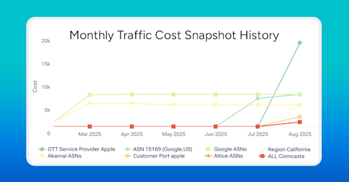 Imagine you’re a streaming company evaluating your costs to serve content to subscribers in California. Subscription growth is booming, so you want to understand costs to serve that region and whether to invest in better connectivity. With Traffic Costs, you can instantly compare how much it costs to deliver traffic into top ISPs across California, or by that particular region/state.