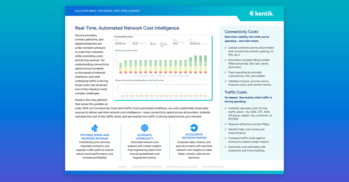 “Kentik Traffic Costs is like putting our connectivity spend under an X-ray. We now have instant visibility into which portions of our traffic are driving costs – and exactly where to optimize for performance and savings.”