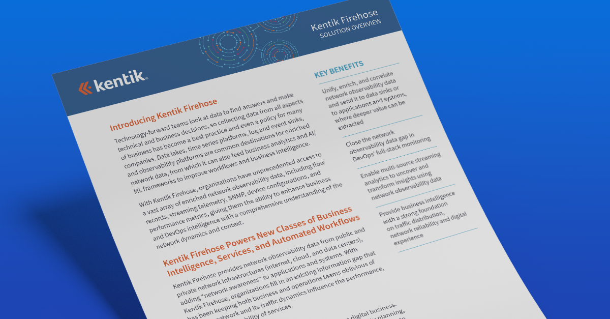 Kentik processes hundreds of trillions of network records, logs, streaming telemetry, SNMP, and synthetic tests, and enriches them with the context of application, routing, location, and more.