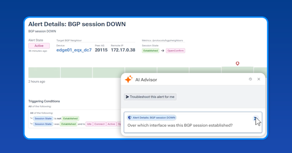 In this walkthrough, we use AI Advisor to diagnose a BGP session failure. See how AI Advisor eliminates manual investigation to get your network back online faster than ever.