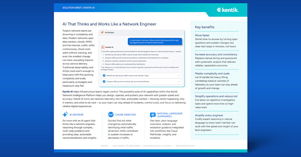 Kentik AI Advisor is a powerful new AI that deeply understands your network, reasons through complex issues, and delivers clear, actionable guidance for designing, operating, and protecting your networks.